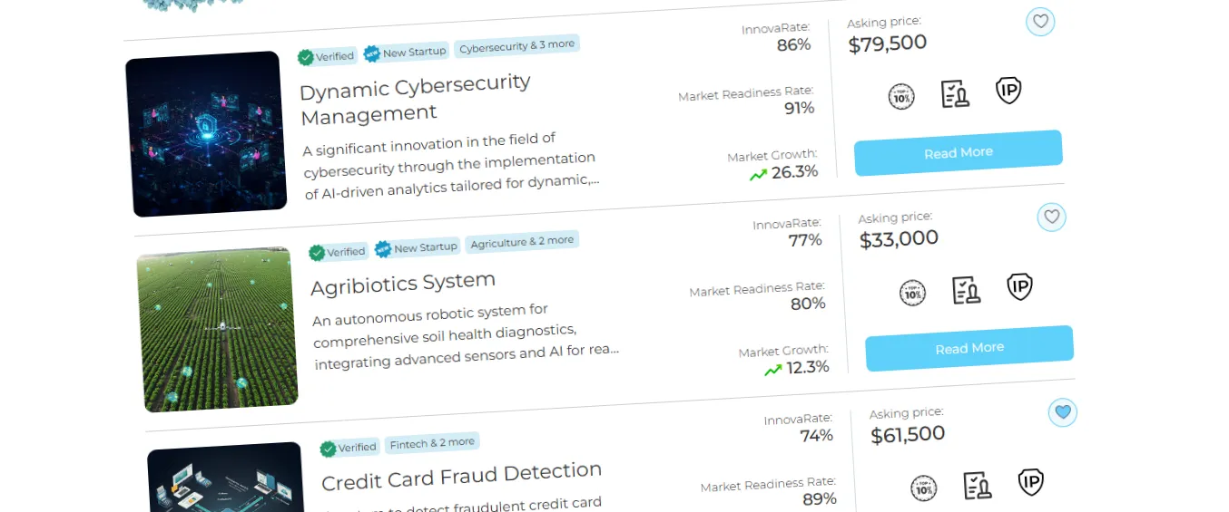 Each venture is strictly validated using our proprietary InnovaRate™ success algorithm. Only when it reaches a high-potential score (70%+) does it show up in our marketplace.